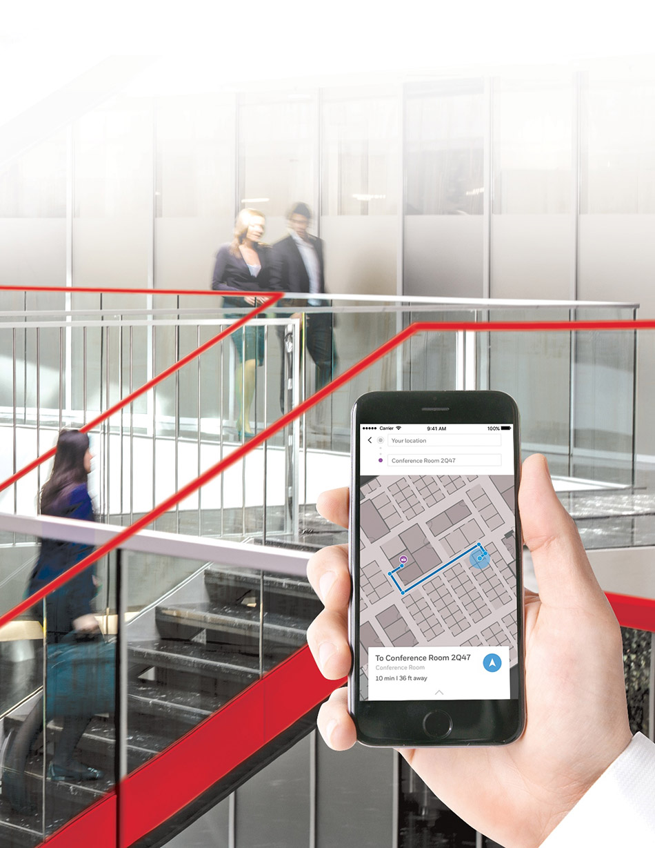 The indoor navigation feature uses GPS-like technology and can help users find their way around complex buildings that are difficult to navigate. The rating feature allows building users to flag-up comfort issues to building staff for quick resolution.