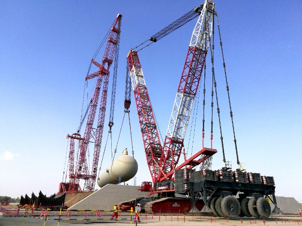 Conducted at the Liwa Plastics Industries Complex (LPIC) project which is owned by Orpic, the bullets – each measuring 6 m in length and 7.8m in diameter – were positioned on sand beds in a synchronized tandem lift utilising a 1600-ton PTC ring crane and a 1,200t crawler crane, said Mammoet.