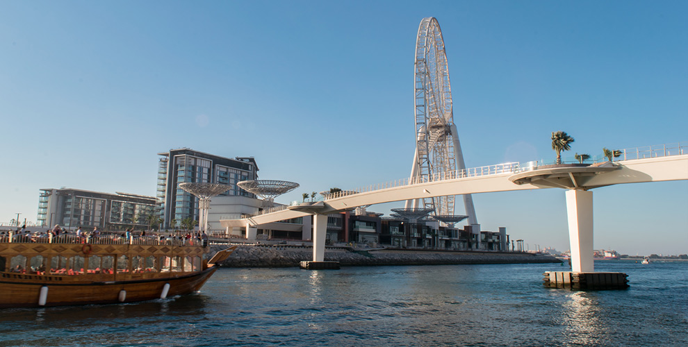 The striking 77m-span box-girder bridge project is intended to form a link between Meraas’ The Beach opposite JBR and its Bluewaters waterfront resort where visitors can ride the world’s tallest and largest observation wheel, Ain Dubai.
