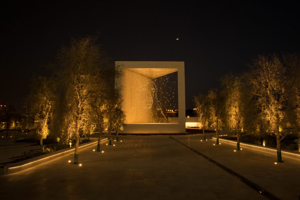 The artwork weighs 250 tonnes, and the steel structure of the roof supporting it weighs 190t. More than 5,745 counterweights hold the suspended shapes in place to form a series of profiles of Sheikh Zayed from different perspectives, both within the memorial’s landscape and from outside, along the Corniche, where the project is located. Illuminated by more than 2,000 lights, the suspended shapes of ‘The Constellation’ shine like stars at night.